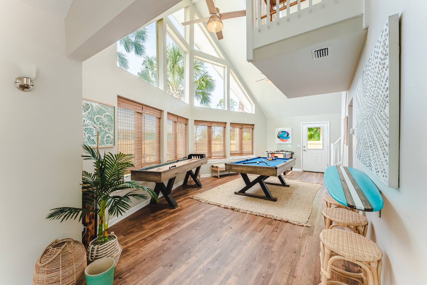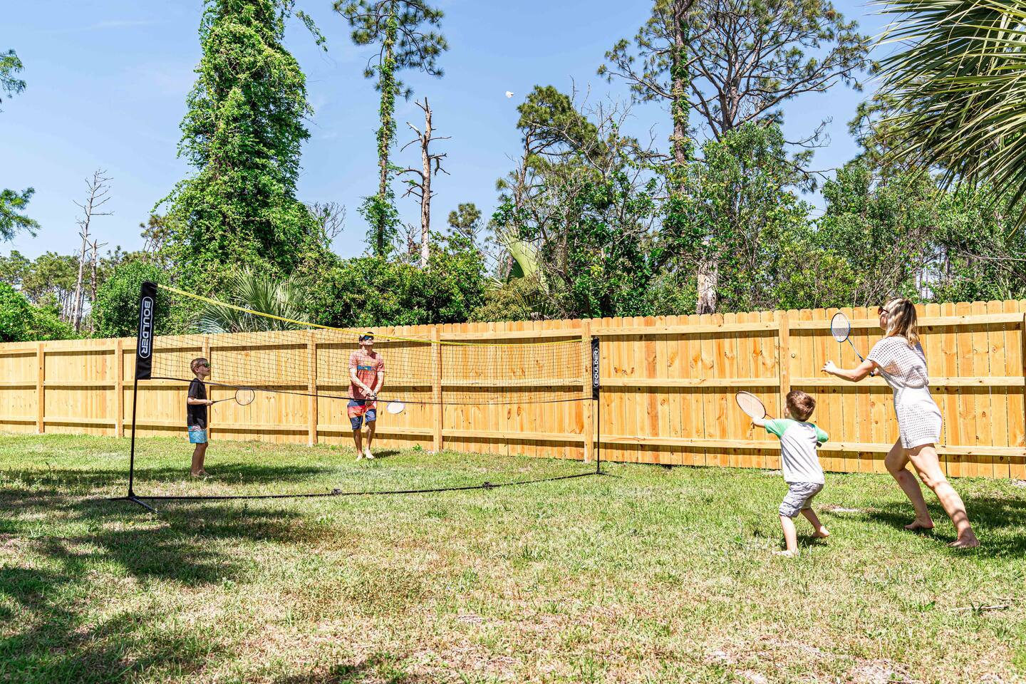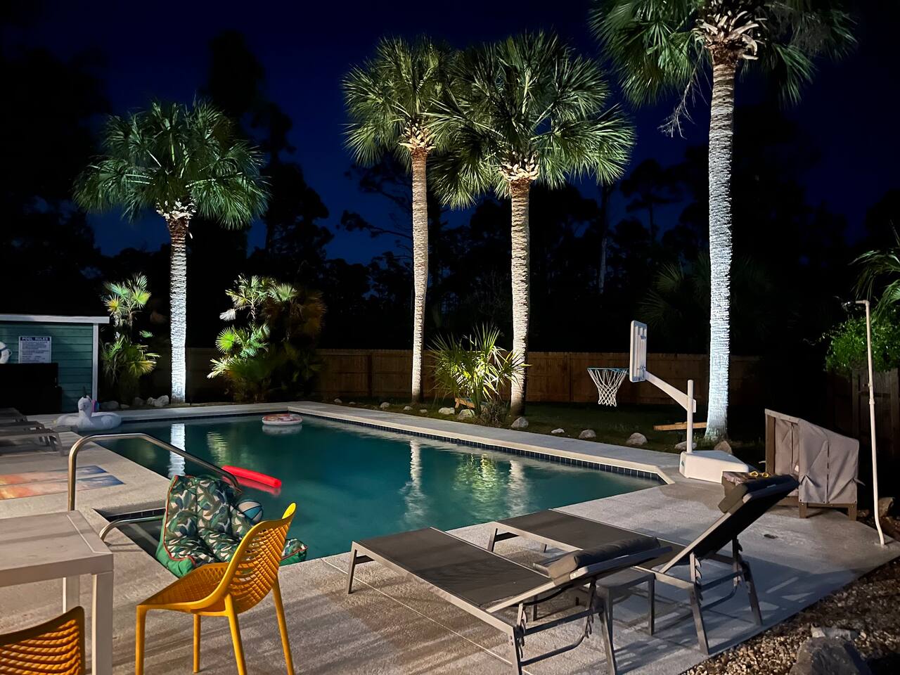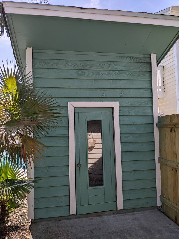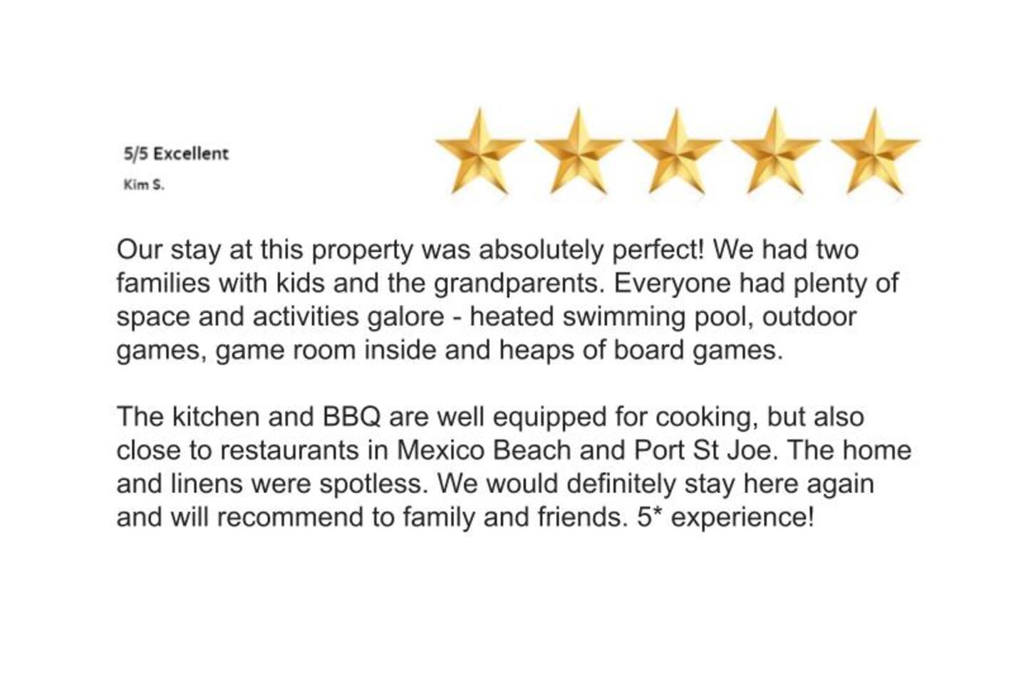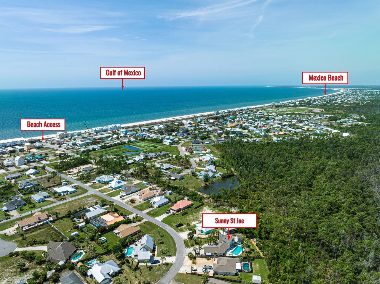 A rare forest-backed home designed for families and groups to spread out, relax, and reconnect. Two bedroom wings give everyone privacy, while the central living area flows naturally to the pool deck for perfect indoor–outdoor living. BEDROOMS (5) All bedrooms include high-end linens, blackout curtains & comfortable mattresses ✹ Primary: King, ensuite bath, 50” Roku TV, private balcony ✹ Bedroom 2: King, 43” TV, direct pool access ✹ Bedroom 3: Queen, direct pool access ✹ Bedroom 4: Queen, ensuite bath, 32” TV ✹ Kids Room: 2 bunk beds + bookshelf of kids’ books BATHROOMS (3) Bright, modern bathrooms with everything you need for longer stays. ✹ Two double vanities + tubs ✹ Shampoo/conditioner/body wash provided ✹ Hair dryers ✹ Washer/dryer KITCHEN + DINING A fully stocked kitchen made for group meals. ✹ Stainless steel appliances ✹ Dual Keurig (pods + grounds) ✹ Spices, oils & dry goods ✹ Full cooking essentials ✹ Welcome basket ✹ Rustic dining table for 9 LIVING ROOM Relax in a warm, beach-inspired space with pool views. ✹ 58" Roku smart TV + Sling TV ✹ Electric fireplace ✹ Sliding doors to pool deck ✹ Local recommendation guidebook GAME ROOM Hands-down our guests' favorite room with enough fun to keep the entire family entertained for hours! ✹ Pool table, shuffleboard, foosball ✹ Giant Connect 4 ✹ Surfboard bar + stools ✹ Board games, puzzles ✹ Vaulted ceilings + natural light ✹ Bluetooth speaker POOL DECK A standout feature with all-day sun and a forest backdrop. ✹ Heated 6’ pool ✹ Grill + outdoor dining ✹ 6 loungers + kids double lounger ✹ Ping pong ✹ Pool basketball + volleyball ✹ Outdoor shower ✹ Bluetooth speaker BACKYARD FUN ✹ Sauna ✹ Fire pit ✹ Cornhole, bocce ball, badminton ✹ Badminton OTHER AMENITIES ✹ Electric golf cart ✹ High-speed WiFi + work area w/ monitor ✹ Yoga mats ✹ Iron + ironing board ✹ Kids' high chair ✹ Snorkels + fins ✹ Beach chairs (4) + umbrella + wagon + toys ✹ Second kitchen (fridge, oven, microwave) ✹ Additional family room w/ daybed + 50” TV ✹ Nintendo Switch docking station (bring games) ✹ Screened front porch ✹ Exterior security cameras ACTIVITIES / ATTRACTIONS ✹ St Joe Beach: 0.3 miles ✹ Mexico Beach: 2 miles ✹ Panhandle Adventures Dolphin Tours: 2.7 miles ✹ Port St Joe Fishing Charters: 8.6 miles ✹ Pickleball Courts at Frank Pate Park: 8.6 miles ✹ Downtown Port St Joe: 8.7 miles ✹ Port St Joe Salt Air Farmers Market: 8.7 miles ✹ Forgotten Coast Sea Turtle Center: 9.7 miles ✹ Rockin’ M Ranch Horseback Riding: 17.6 miles ✹ Cape San Blas: 20.5 miles ✹ T.H. Stone Memorial St. Joseph Peninsula State Park: 29 miles ✹ Panama City Beach: 37.9 miles WHAT OUR GUESTS LOVE ✹ “So much to do - heated pool, outdoor games, full game room. Spotless and perfect for families.” ✹ “Two wings + big common area made it ideal for multigenerational trips.” ✹ “Walkable to the gulf, golf cart included, and the kids never got bored!” ✹ “A kid’s paradise. Best-equipped house we’ve ever stayed in.” ✹ “Private feel with the forest behind the pool - amazing!” Bring the whole crew - this home fills fast for family trips and group getaways. Reserve now!