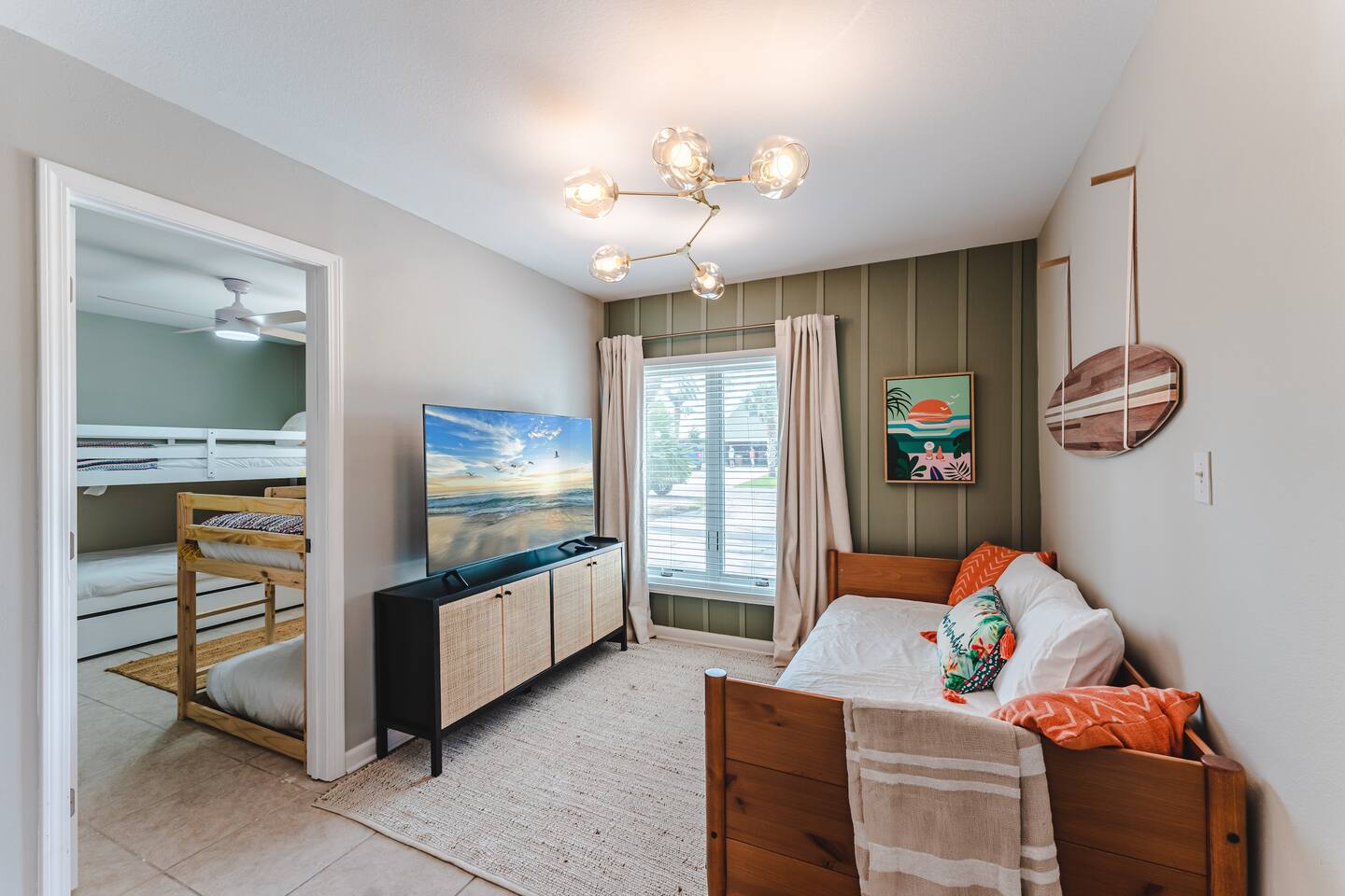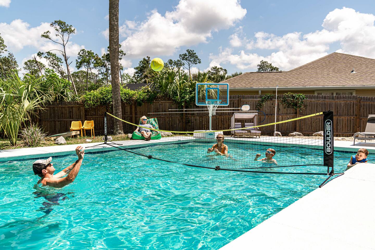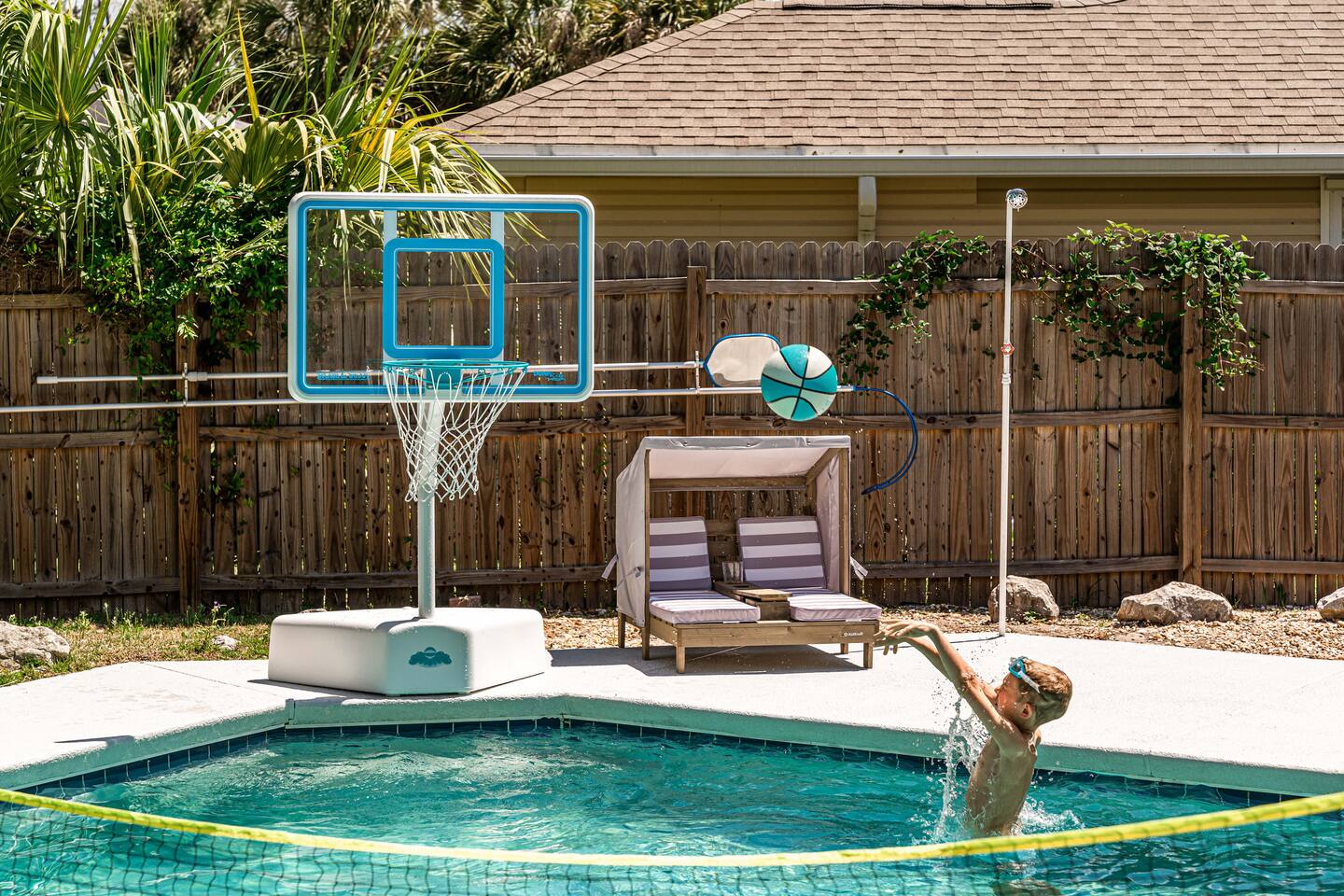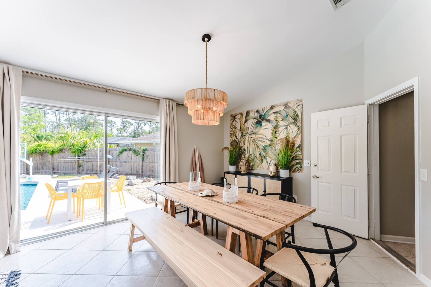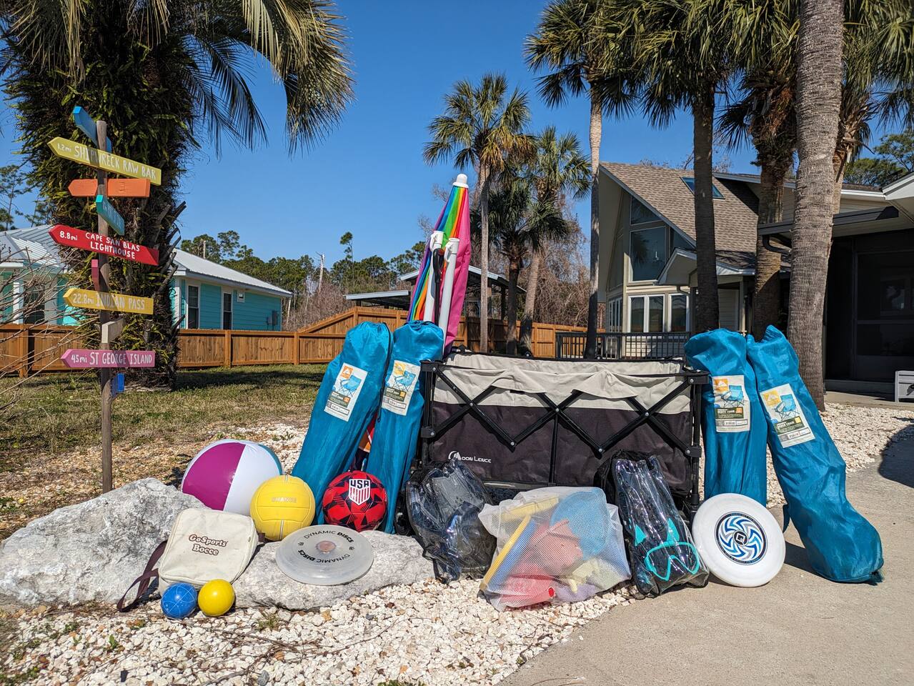 A rare forest-backed home designed for families and groups to spread out, relax, and reconnect. Two bedroom wings give everyone privacy, while the central living area flows naturally to the pool deck for perfect indoor–outdoor living. BEDROOMS (5) All bedrooms include high-end linens, blackout curtains & comfortable mattresses ✹ Primary: King, ensuite bath, 50” Roku TV, private balcony ✹ Bedroom 2: King, 43” TV, direct pool access ✹ Bedroom 3: Queen, direct pool access ✹ Bedroom 4: Queen, ensuite bath, 32” TV ✹ Kids Room: 2 bunk beds + bookshelf of kids’ books BATHROOMS (3) Bright, modern bathrooms with everything you need for longer stays. ✹ Two double vanities + tubs ✹ Shampoo/conditioner/body wash provided ✹ Hair dryers ✹ Washer/dryer KITCHEN + DINING A fully stocked kitchen made for group meals. ✹ Stainless steel appliances ✹ Dual Keurig (pods + grounds) ✹ Spices, oils & dry goods ✹ Full cooking essentials ✹ Welcome basket ✹ Rustic dining table for 9 LIVING ROOM Relax in a warm, beach-inspired space with pool views. ✹ 58" Roku smart TV + Sling TV ✹ Electric fireplace ✹ Sliding doors to pool deck ✹ Local recommendation guidebook GAME ROOM Hands-down our guests' favorite room with enough fun to keep the entire family entertained for hours! ✹ Pool table, shuffleboard, foosball ✹ Giant Connect 4 ✹ Surfboard bar + stools ✹ Board games, puzzles ✹ Vaulted ceilings + natural light ✹ Bluetooth speaker POOL DECK A standout feature with all-day sun and a forest backdrop. ✹ Heated 6’ pool ✹ Grill + outdoor dining ✹ 6 loungers + kids double lounger ✹ Ping pong ✹ Pool basketball + volleyball ✹ Outdoor shower ✹ Bluetooth speaker BACKYARD FUN ✹ Sauna ✹ Fire pit ✹ Cornhole, bocce ball, badminton ✹ Badminton OTHER AMENITIES ✹ Electric golf cart ✹ High-speed WiFi + work area w/ monitor ✹ Yoga mats ✹ Iron + ironing board ✹ Kids' high chair ✹ Snorkels + fins ✹ Beach chairs (4) + umbrella + wagon + toys ✹ Second kitchen (fridge, oven, microwave) ✹ Additional family room w/ daybed + 50” TV ✹ Nintendo Switch docking station (bring games) ✹ Screened front porch ✹ Exterior security cameras ACTIVITIES / ATTRACTIONS ✹ St Joe Beach: 0.3 miles ✹ Mexico Beach: 2 miles ✹ Panhandle Adventures Dolphin Tours: 2.7 miles ✹ Port St Joe Fishing Charters: 8.6 miles ✹ Pickleball Courts at Frank Pate Park: 8.6 miles ✹ Downtown Port St Joe: 8.7 miles ✹ Port St Joe Salt Air Farmers Market: 8.7 miles ✹ Forgotten Coast Sea Turtle Center: 9.7 miles ✹ Rockin’ M Ranch Horseback Riding: 17.6 miles ✹ Cape San Blas: 20.5 miles ✹ T.H. Stone Memorial St. Joseph Peninsula State Park: 29 miles ✹ Panama City Beach: 37.9 miles WHAT OUR GUESTS LOVE ✹ “So much to do - heated pool, outdoor games, full game room. Spotless and perfect for families.” ✹ “Two wings + big common area made it ideal for multigenerational trips.” ✹ “Walkable to the gulf, golf cart included, and the kids never got bored!” ✹ “A kid’s paradise. Best-equipped house we’ve ever stayed in.” ✹ “Private feel with the forest behind the pool - amazing!” Bring the whole crew - this home fills fast for family trips and group getaways. Reserve now!
