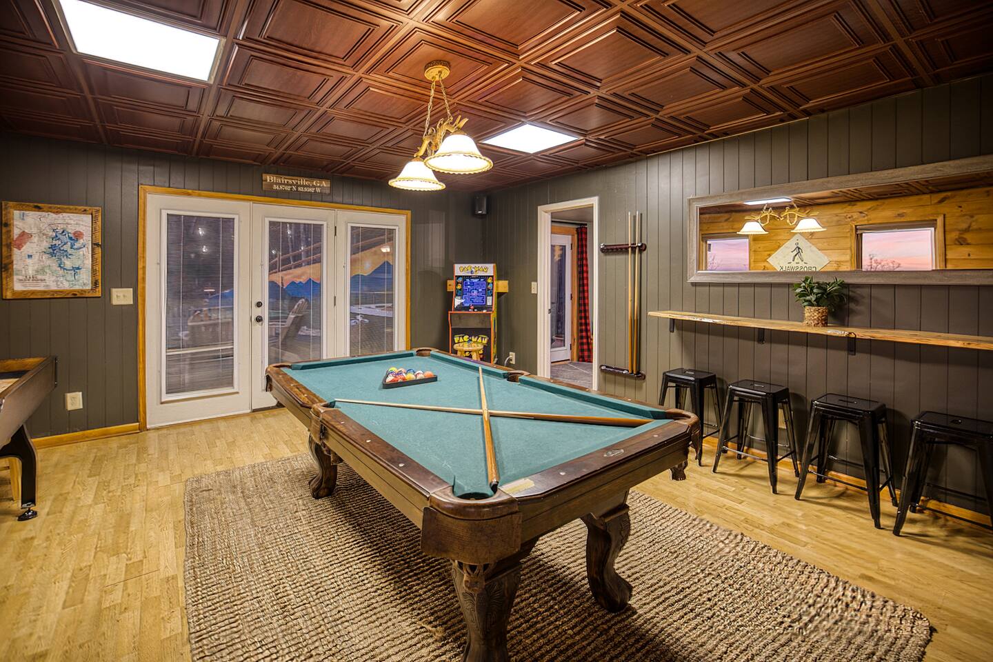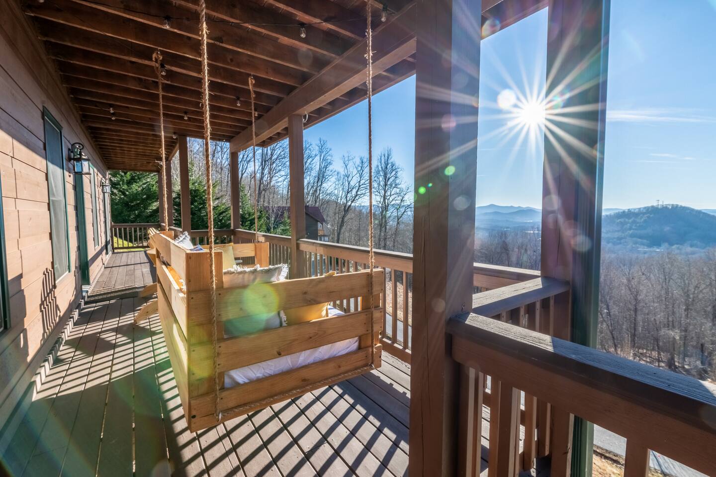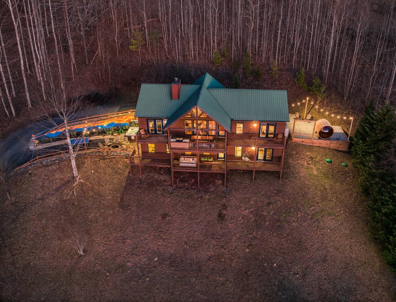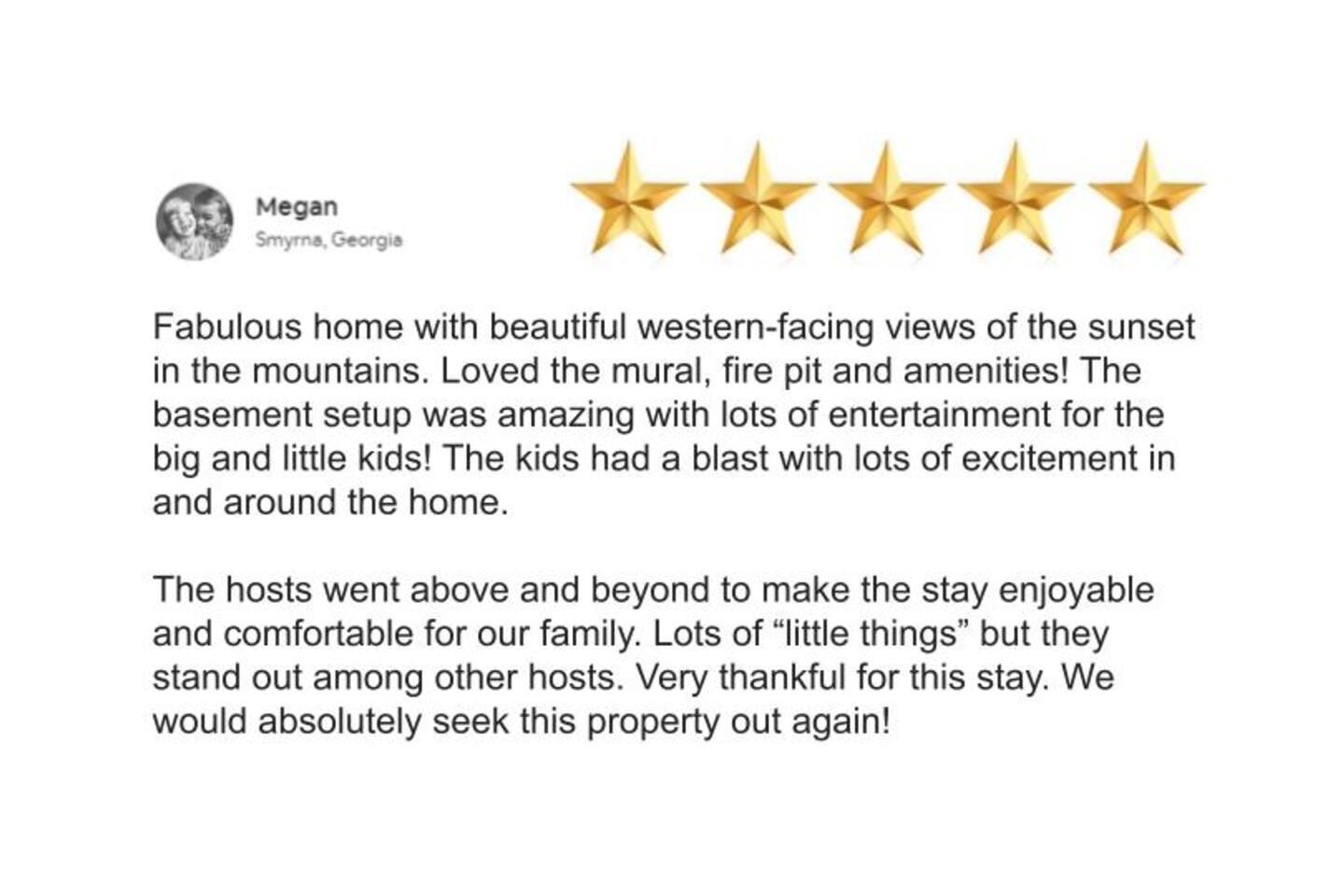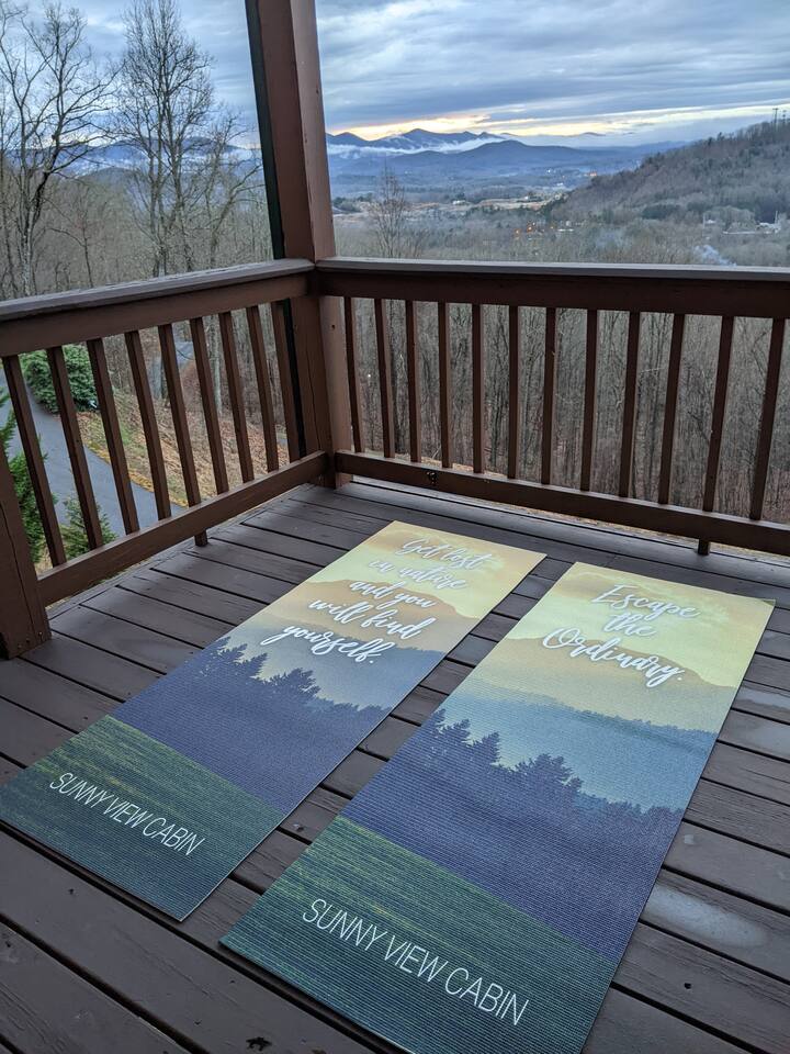 Designed for unforgettable family fun, the home features a 7-person hot tub, fire pit with firewood provided, and a fully loaded game room with pool, shuffleboard, foosball, ping pong, Pac-Man, Nintendo Switch, giant yard games, and board games for every age. BEDROOMS Each of the four beautifully furnished bedrooms includes high-end linens, plush mattresses, and modern comforts to ensure deep relaxation. ✹ Primary: King bed, ensuite bath, 50” Roku TV, private balcony with rocking chairs & sweeping mountain views ✹ Upper King: Ensuite bath, 50” Roku TV, balcony with panoramic views ✹ Lower Queen: Ensuite bath, 42” TV, patio access with Adirondack chairs ✹ Kids Room: Two custom bunk beds + daybed w/ trundle, books, and cozy play space BATHROOMS Three full bathrooms feature double vanities, bathtubs for little ones, soft linens, hair dryers, and shampoo/conditioner/body wash provided. Washer + dryer included. KITCHEN + DINING Cook, gather, and enjoy! The fully stocked kitchen includes a Keurig dual-brew system, cooking essentials, spices, oils, dry goods, and a welcome basket with s’mores & fire starter provided. Share meals at the modern rustic 10-person dining table. LIVING ROOM Relax in front of the natural stone gas fireplace, enjoy the 58” smart TV with 190 Dish Network channels, and take in the spectacular mountain views from the oversized windows. A physical guidebook highlights our favorite local hikes, waterfalls, wineries, and adventures! GAME ROOM The ultimate family hangout! Unwind, compete, or cheer from the live-edge bar while enjoying: Pool · Shuffleboard · Pac-Man · 65” TV · Nintendo Switch dock + controllers · Giant Jenga · Giant Connect 4 · Puzzles · Board games galore! DECKS Savor the best west-facing sunset views in the area from two expansive decks with a 12-person dining table, rocking chairs, Adirondacks, a bed swing, egg chair, café string lights, and live-edge bar seating. Grill your favorites on the gas BBQ! OUTDOOR FUN ZONE Enjoy the finest outdoor living the Blue Ridge mountains offer! ✹ 7-person hot tub (lights + Bluetooth speakers) ✹ Fire pit with firewood provided ✹ Cornhole · Foosball · Ping Pong · Kan Jam OTHER AMENITIES ✹ High-speed WiFi throughout the home ✹ Designated work area w/ second monitor and lamp ✹ Yoga mats ✹ Adjustable dumbbells ✹ Iron and ironing board ✹ Kids high chair ✹ Toddler bed frame + mattress ✹ Rolling cooler ✹ Exterior cameras for cabin security ACTIVITIES / ATTRACTIONS ✹ The Spa at Blueberry Hill: 2.9 miles ✹ Grandaddy Mimm's Distilling Co: 3.1 miles ✹ Meeks Park & Trails: 3.5 miles ✹ Butternut Creek Golf Course: 3.6 miles ✹ Trackrock Stables: 8.0 miles ✹ Vogel State Park: 9.9 miles ✹ Old Union Golf Course: 9.9 miles ✹ Living Water Winery & Vineyard: 10.2 miles ✹ Odom Springs Vineyard: 11.4 miles ✹ Nottely Lake: 11.5 miles ✹ Helton Creek Falls: 13 miles ✹ Blood Mountain/Appalachian Trail: 13 miles ✹ Crane Creek Winery: 15.1 miles ✹ Brasstown Bald: 15.7 miles ✹ DeSoto Falls: 16 miles ✹ Lake Chatuge Beach: 17.8 miles ✹ Blue Ridge: 25.6 miles ✹ Helen: 25.7 miles ✹ Harrah's Casino: 27.0 miles WHAT OUR GUESTS LOVE ✹ The home is lovely, warm and inviting......Tim and Katie have thought of everything to make their home comfortable and the perfect place to stay in the Georgia mountains. The view is the icing on the cake........ what a beautiful view they have from just about every room! ✹ The house was amazing with small thoughtful touches. My nieces loved the downstairs where there are so many games and things to keep the kids attention. I can’t rave enough about this place! ✹ If I could give a 6 star rating for Tim & Katie regarding their timely & prompt communication I would definitely do so! AWESOME hosts & lovely home!! ✹ This place is incredible and a stunning location. Last house on the block on a beautiful mountain side looking at sunset. ✹ Fabulous home with beautiful western-facing views of the sunset in the mountains. Loved the mural, fire pit and amenities! The basement setup was amazing with lots of entertainment for the big and little kids! Book your mountain getaway today - peak-season dates fill fast!