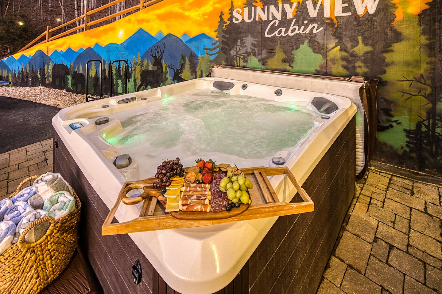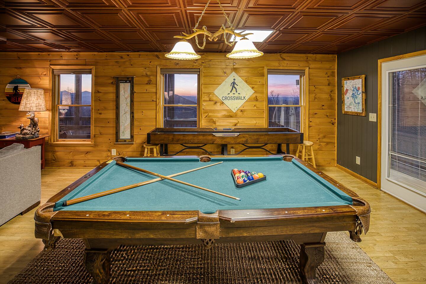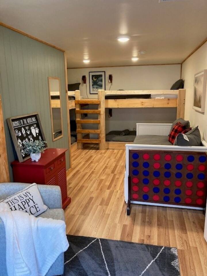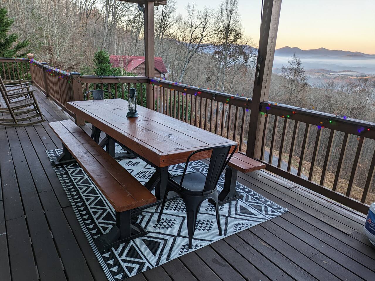 Designed for unforgettable family fun, the home features a 7-person hot tub, fire pit with firewood provided, and a fully loaded game room with pool, shuffleboard, foosball, ping pong, Pac-Man, Nintendo Switch, giant yard games, and board games for every age. BEDROOMS Each of the four beautifully furnished bedrooms includes high-end linens, plush mattresses, and modern comforts to ensure deep relaxation. ✹ Primary: King bed, ensuite bath, 50” Roku TV, private balcony with rocking chairs & sweeping mountain views ✹ Upper King: Ensuite bath, 50” Roku TV, balcony with panoramic views ✹ Lower Queen: Ensuite bath, 42” TV, patio access with Adirondack chairs ✹ Kids Room: Two custom bunk beds + daybed w/ trundle, books, and cozy play space BATHROOMS Three full bathrooms feature double vanities, bathtubs for little ones, soft linens, hair dryers, and shampoo/conditioner/body wash provided. Washer + dryer included. KITCHEN + DINING Cook, gather, and enjoy! The fully stocked kitchen includes a Keurig dual-brew system, cooking essentials, spices, oils, dry goods, and a welcome basket with s’mores & fire starter provided. Share meals at the modern rustic 10-person dining table. LIVING ROOM Relax in front of the natural stone gas fireplace, enjoy the 58” smart TV with 190 Dish Network channels, and take in the spectacular mountain views from the oversized windows. A physical guidebook highlights our favorite local hikes, waterfalls, wineries, and adventures! GAME ROOM The ultimate family hangout! Unwind, compete, or cheer from the live-edge bar while enjoying: Pool · Shuffleboard · Pac-Man · 65” TV · Nintendo Switch dock + controllers · Giant Jenga · Giant Connect 4 · Puzzles · Board games galore! DECKS Savor the best west-facing sunset views in the area from two expansive decks with a 12-person dining table, rocking chairs, Adirondacks, a bed swing, egg chair, café string lights, and live-edge bar seating. Grill your favorites on the gas BBQ! OUTDOOR FUN ZONE Enjoy the finest outdoor living the Blue Ridge mountains offer! ✹ 7-person hot tub (lights + Bluetooth speakers) ✹ Fire pit with firewood provided ✹ Cornhole · Foosball · Ping Pong · Kan Jam OTHER AMENITIES ✹ High-speed WiFi throughout the home ✹ Designated work area w/ second monitor and lamp ✹ Yoga mats ✹ Adjustable dumbbells ✹ Iron and ironing board ✹ Kids high chair ✹ Toddler bed frame + mattress ✹ Rolling cooler ✹ Exterior cameras for cabin security ACTIVITIES / ATTRACTIONS ✹ The Spa at Blueberry Hill: 2.9 miles ✹ Grandaddy Mimm's Distilling Co: 3.1 miles ✹ Meeks Park & Trails: 3.5 miles ✹ Butternut Creek Golf Course: 3.6 miles ✹ Trackrock Stables: 8.0 miles ✹ Vogel State Park: 9.9 miles ✹ Old Union Golf Course: 9.9 miles ✹ Living Water Winery & Vineyard: 10.2 miles ✹ Odom Springs Vineyard: 11.4 miles ✹ Nottely Lake: 11.5 miles ✹ Helton Creek Falls: 13 miles ✹ Blood Mountain/Appalachian Trail: 13 miles ✹ Crane Creek Winery: 15.1 miles ✹ Brasstown Bald: 15.7 miles ✹ DeSoto Falls: 16 miles ✹ Lake Chatuge Beach: 17.8 miles ✹ Blue Ridge: 25.6 miles ✹ Helen: 25.7 miles ✹ Harrah's Casino: 27.0 miles WHAT OUR GUESTS LOVE ✹ The home is lovely, warm and inviting......Tim and Katie have thought of everything to make their home comfortable and the perfect place to stay in the Georgia mountains. The view is the icing on the cake........ what a beautiful view they have from just about every room! ✹ The house was amazing with small thoughtful touches. My nieces loved the downstairs where there are so many games and things to keep the kids attention. I can’t rave enough about this place! ✹ If I could give a 6 star rating for Tim & Katie regarding their timely & prompt communication I would definitely do so! AWESOME hosts & lovely home!! ✹ This place is incredible and a stunning location. Last house on the block on a beautiful mountain side looking at sunset. ✹ Fabulous home with beautiful western-facing views of the sunset in the mountains. Loved the mural, fire pit and amenities! The basement setup was amazing with lots of entertainment for the big and little kids! Book your mountain getaway today - peak-season dates fill fast!