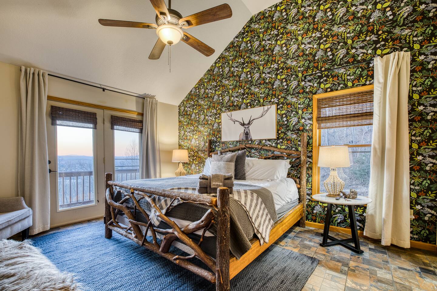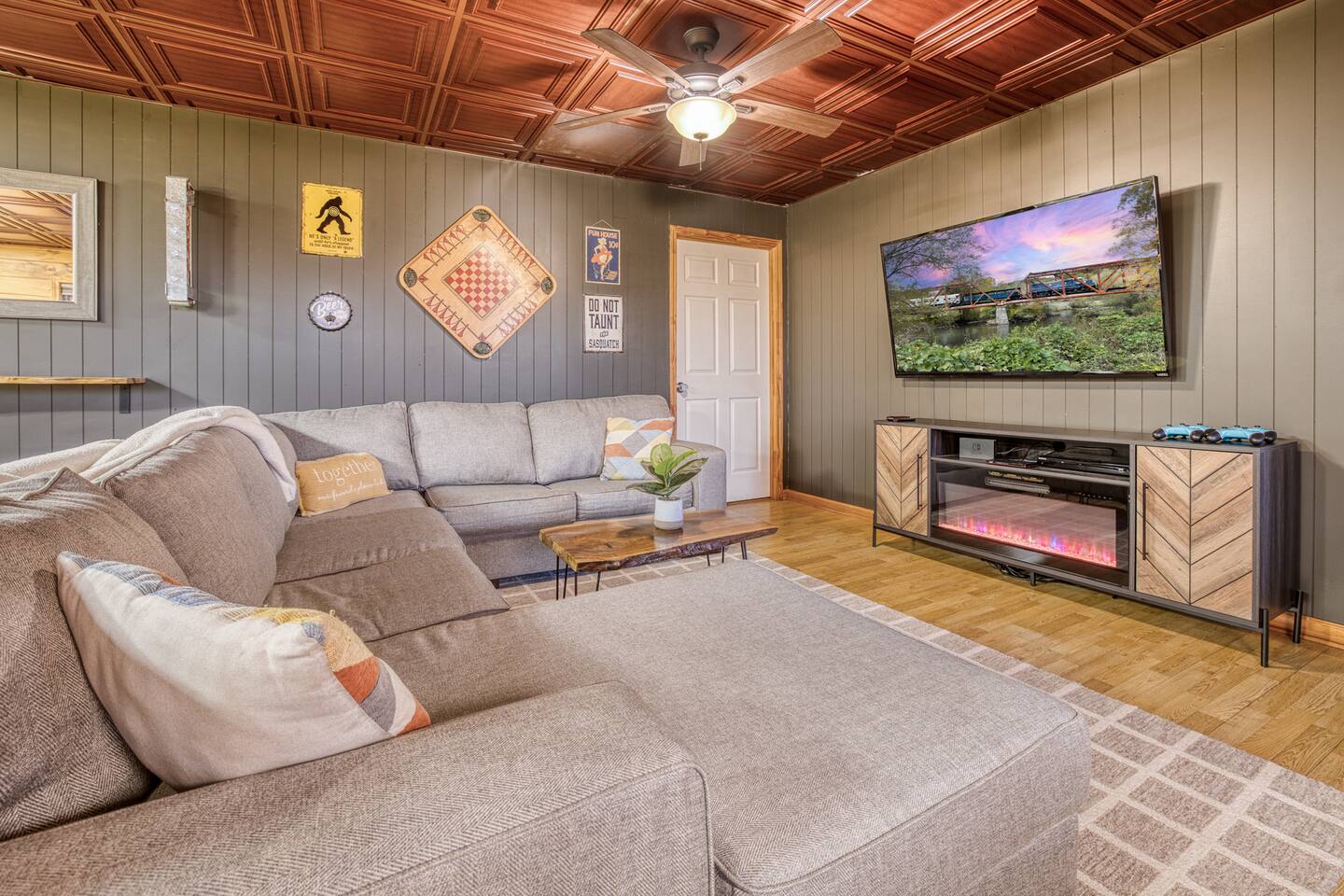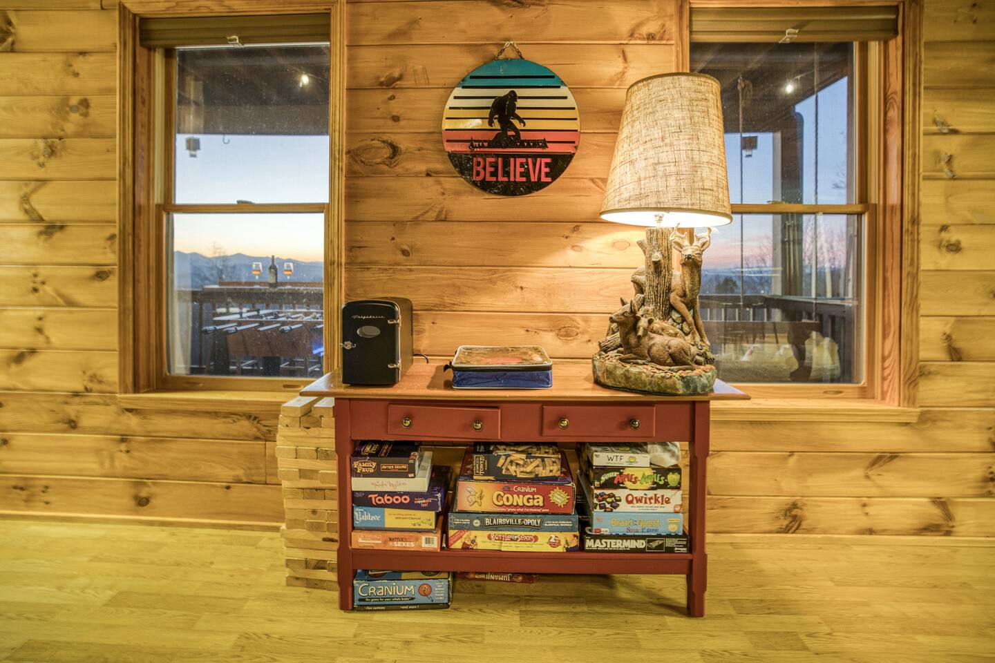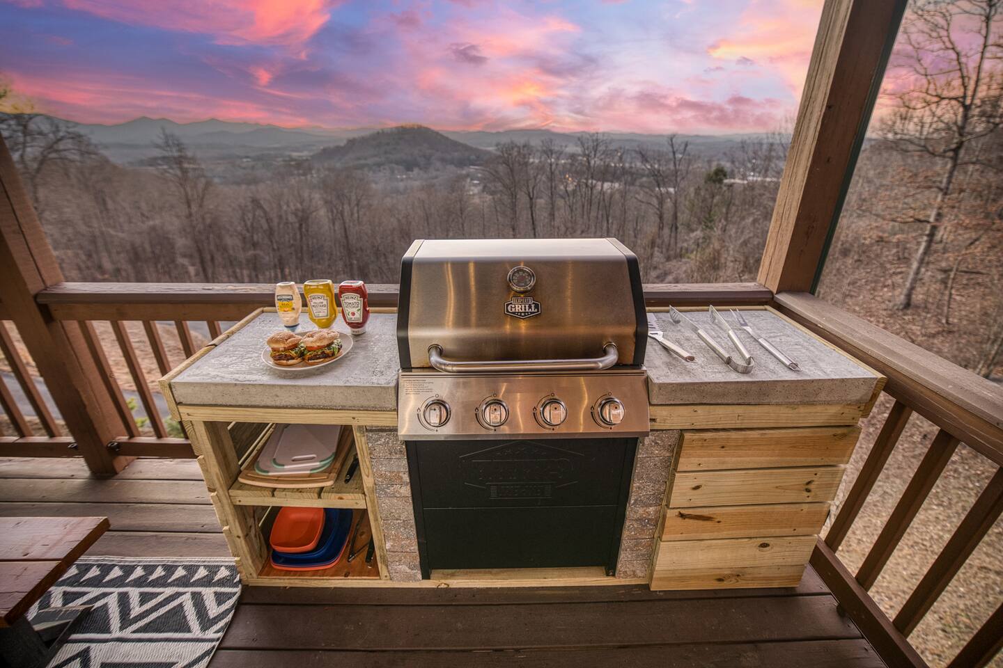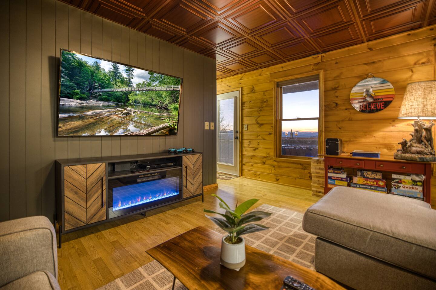 Designed for unforgettable family fun, the home features a 7-person hot tub, fire pit with firewood provided, and a fully loaded game room with pool, shuffleboard, foosball, ping pong, Pac-Man, Nintendo Switch, giant yard games, and board games for every age. BEDROOMS Each of the four beautifully furnished bedrooms includes high-end linens, plush mattresses, and modern comforts to ensure deep relaxation. ✹ Primary: King bed, ensuite bath, 50” Roku TV, private balcony with rocking chairs & sweeping mountain views ✹ Upper King: Ensuite bath, 50” Roku TV, balcony with panoramic views ✹ Lower Queen: Ensuite bath, 42” TV, patio access with Adirondack chairs ✹ Kids Room: Two custom bunk beds + daybed w/ trundle, books, and cozy play space BATHROOMS Three full bathrooms feature double vanities, bathtubs for little ones, soft linens, hair dryers, and shampoo/conditioner/body wash provided. Washer + dryer included. KITCHEN + DINING Cook, gather, and enjoy! The fully stocked kitchen includes a Keurig dual-brew system, cooking essentials, spices, oils, dry goods, and a welcome basket with s’mores & fire starter provided. Share meals at the modern rustic 10-person dining table. LIVING ROOM Relax in front of the natural stone gas fireplace, enjoy the 58” smart TV with 190 Dish Network channels, and take in the spectacular mountain views from the oversized windows. A physical guidebook highlights our favorite local hikes, waterfalls, wineries, and adventures! GAME ROOM The ultimate family hangout! Unwind, compete, or cheer from the live-edge bar while enjoying: Pool · Shuffleboard · Pac-Man · 65” TV · Nintendo Switch dock + controllers · Giant Jenga · Giant Connect 4 · Puzzles · Board games galore! DECKS Savor the best west-facing sunset views in the area from two expansive decks with a 12-person dining table, rocking chairs, Adirondacks, a bed swing, egg chair, café string lights, and live-edge bar seating. Grill your favorites on the gas BBQ! OUTDOOR FUN ZONE Enjoy the finest outdoor living the Blue Ridge mountains offer! ✹ 7-person hot tub (lights + Bluetooth speakers) ✹ Fire pit with firewood provided ✹ Cornhole · Foosball · Ping Pong · Kan Jam OTHER AMENITIES ✹ High-speed WiFi throughout the home ✹ Designated work area w/ second monitor and lamp ✹ Yoga mats ✹ Adjustable dumbbells ✹ Iron and ironing board ✹ Kids high chair ✹ Toddler bed frame + mattress ✹ Rolling cooler ✹ Exterior cameras for cabin security ACTIVITIES / ATTRACTIONS ✹ The Spa at Blueberry Hill: 2.9 miles ✹ Grandaddy Mimm's Distilling Co: 3.1 miles ✹ Meeks Park & Trails: 3.5 miles ✹ Butternut Creek Golf Course: 3.6 miles ✹ Trackrock Stables: 8.0 miles ✹ Vogel State Park: 9.9 miles ✹ Old Union Golf Course: 9.9 miles ✹ Living Water Winery & Vineyard: 10.2 miles ✹ Odom Springs Vineyard: 11.4 miles ✹ Nottely Lake: 11.5 miles ✹ Helton Creek Falls: 13 miles ✹ Blood Mountain/Appalachian Trail: 13 miles ✹ Crane Creek Winery: 15.1 miles ✹ Brasstown Bald: 15.7 miles ✹ DeSoto Falls: 16 miles ✹ Lake Chatuge Beach: 17.8 miles ✹ Blue Ridge: 25.6 miles ✹ Helen: 25.7 miles ✹ Harrah's Casino: 27.0 miles WHAT OUR GUESTS LOVE ✹ The home is lovely, warm and inviting......Tim and Katie have thought of everything to make their home comfortable and the perfect place to stay in the Georgia mountains. The view is the icing on the cake........ what a beautiful view they have from just about every room! ✹ The house was amazing with small thoughtful touches. My nieces loved the downstairs where there are so many games and things to keep the kids attention. I can’t rave enough about this place! ✹ If I could give a 6 star rating for Tim & Katie regarding their timely & prompt communication I would definitely do so! AWESOME hosts & lovely home!! ✹ This place is incredible and a stunning location. Last house on the block on a beautiful mountain side looking at sunset. ✹ Fabulous home with beautiful western-facing views of the sunset in the mountains. Loved the mural, fire pit and amenities! The basement setup was amazing with lots of entertainment for the big and little kids! Book your mountain getaway today - peak-season dates fill fast!