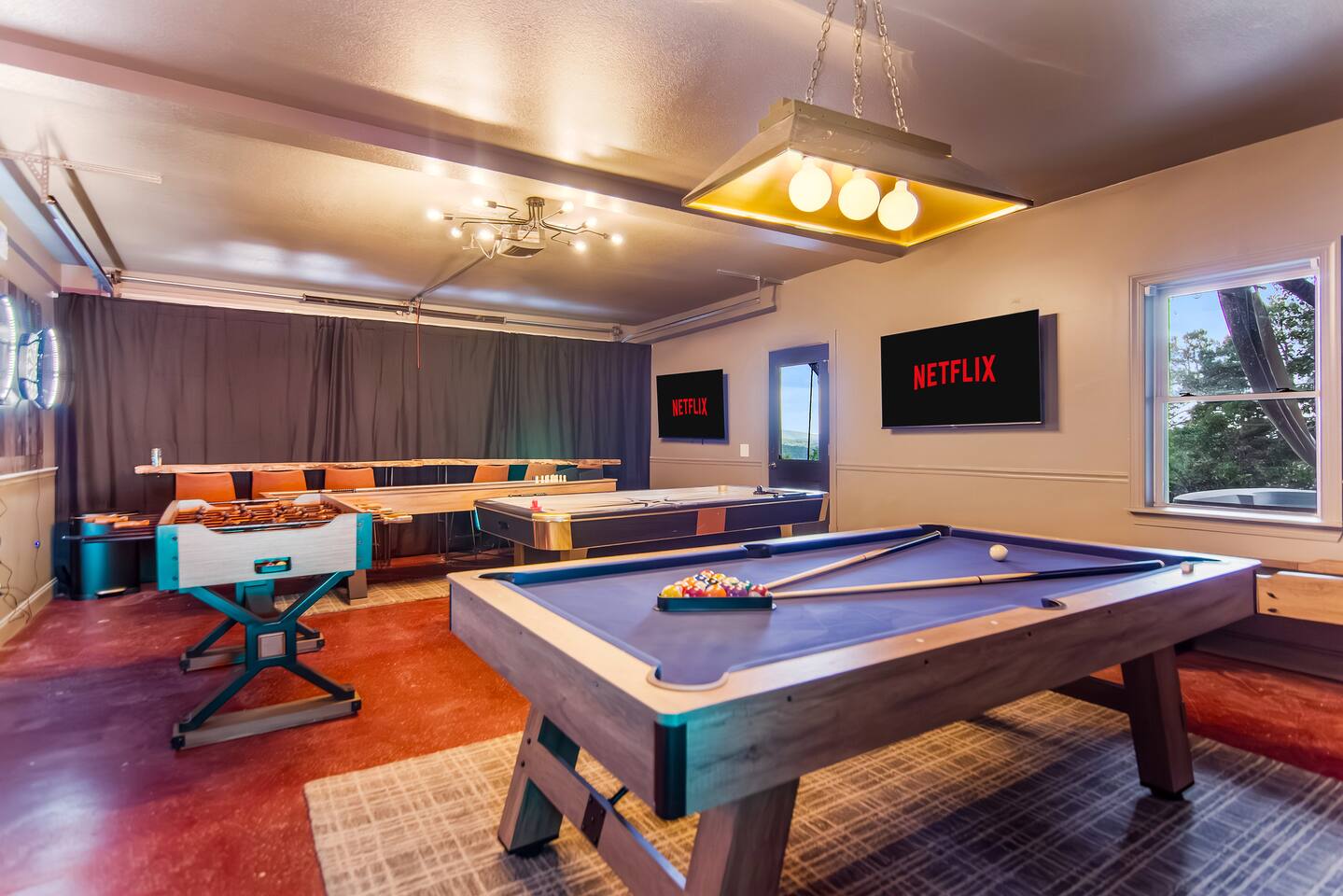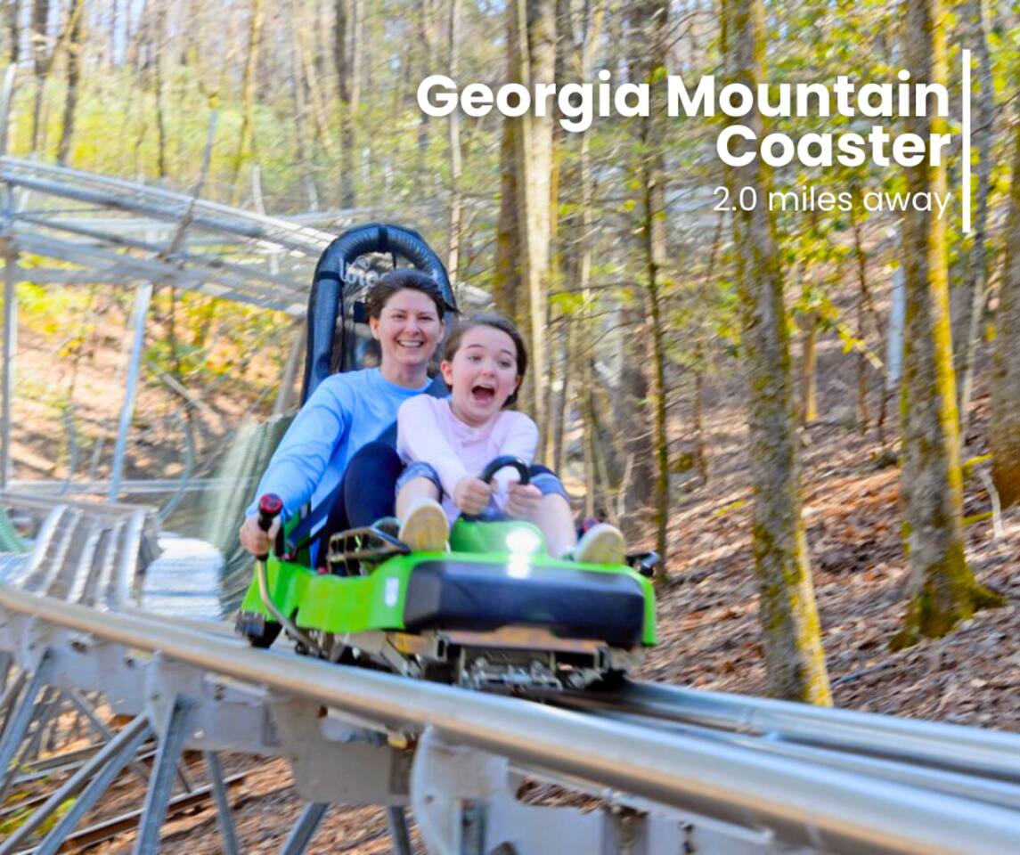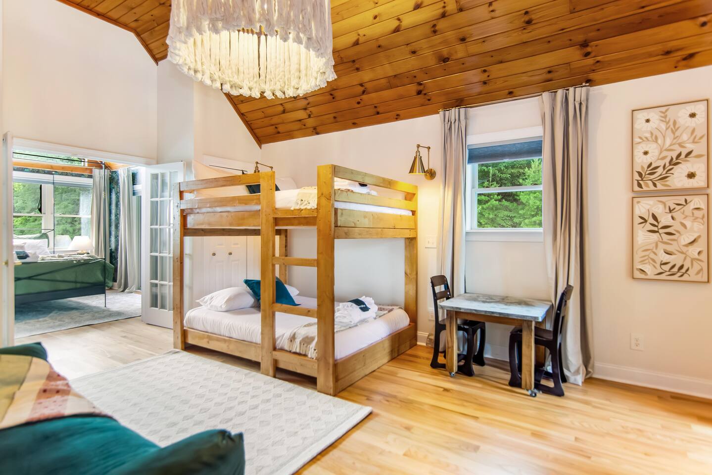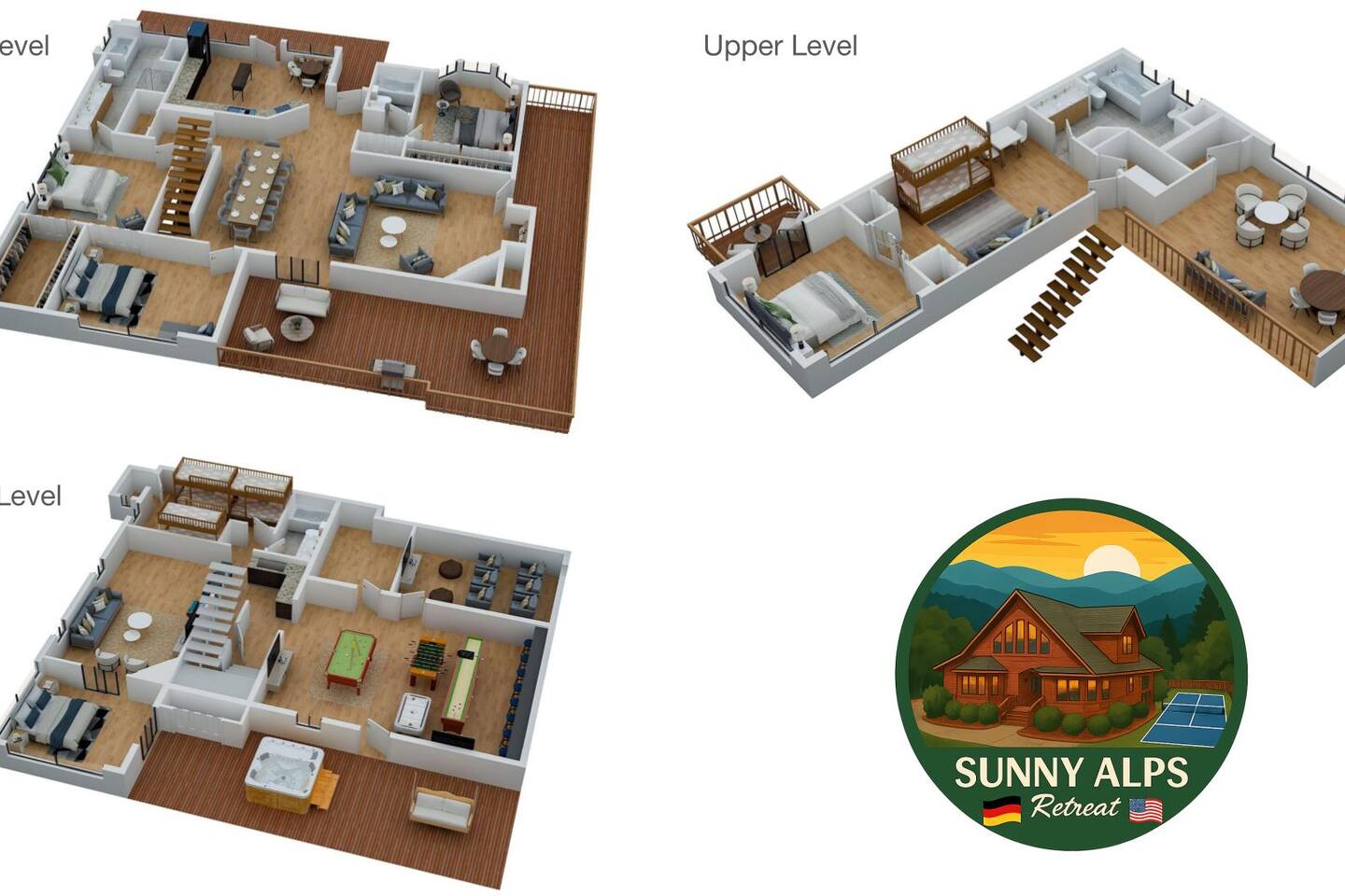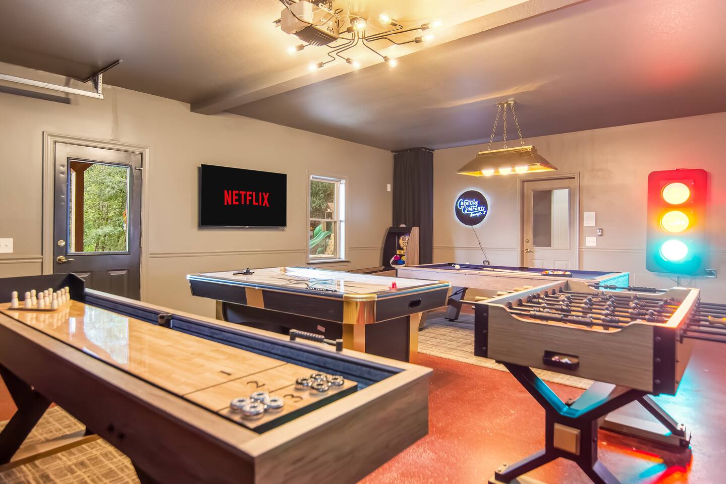 OUTDOOR FUN ZONE Enjoy the finest outdoor living the Blue Ridge Mountains have to offer. ✹ 6-person barrel sauna with panoramic mountain views ✹ 6-person hot tub with programmable LED lights ✹ Premier wooden kids' playground with two slides, a climbing wall, swings, and a lookout tower ✹ Fire pit with 5 Adirondack chairs (firewood provided) ✹ Bed swing ✹ Cornhole ✹ Bocce ball ✹ Badminton ✹ Pickleball court GAME ROOM Hands-down our favorite room with enough fun to keep the entire family entertained for hours! ✹ Pool table ✹ Foosball ✹ Air hockey ✹ Skee ball ✹ Shuffleboard ✹ Two LED-lighting dartboards and scorecard ✹ Street Fighter arcade game ✹ 14-foot live-edge bar and barstool seating for spectators ✹ Two 58" smart TVs MOVIE THEATER ✹ 100" smart TV with surround sound system ✹ Six leather reclining movie theater chairs with cupholders ✹ Two Big Joe bean bag seats ✹ Vintage popcorn machine KIDS GAMING ROOM ✹ Pac-Man arcade game ✹ Golden Tee arcade game ✹ 65" smart TV ✹ Nintendo Switch docking station + 4 controllers ✹ Mitchell Gold Velvet queen-size sleeper sofa ✹ Natural stone gas fireplace LIVING ROOM Enjoy the mountain vibes in this warm living room with views of the mountains and city of Helen. ✹ 65" smart TV ✹ Sling TV with 190 channels ✹ Natural stone gas fireplace ✹ Physical guidebook with local recommendations ✹ Expansive vaulted wood ceiling ✹ Modern mountain decor KITCHEN + DINING This cozy kitchen is fully stocked with everything you’ll need to cook delicious gourmet meals. ✹ Full-size fridge/freezer, dishwasher, 4-burner stove, oven, microwave ✹ Keurig dual coffee machine with both K-cup pods and ground coffee to brew a cup and a carafe of your favorite varieties ✹ Full set of kitchen cooking essentials ✹ Fully-stocked pantry with salt, pepper, spices, and dry goods ✹ Welcome basket with s'mores kit and fire starter ✹ Modern rustic 12-person dining table BEDROOMS 7 bedrooms all equipped with high-end linens, modern furnishings, and comfortable mattresses to ensure that well-deserved rest and relaxation. ✹ Upstairs bedroom 1: king bed, 43” Roku smart TV, private balcony, incredible views of Mt Jonah and the city of Helen ✹ Upstairs bedroom 2: full-over-full custom-built bunk bed, 50” Roku smart TV, two closets, kids' gaming table, leather convertible sofa ✹ Main level bedroom 1: king bed, 50” Roku smart TV, large closet ✹ Main level bedroom 2: king bed, ensuite bath, 50” Roku smart TV, spacious closet ✹ Main level bedroom 3: king bed, 58” Roku smart TV, panormamic mountain view ✹ Lower level bedroom 1: king bed, 43” Roku smart TV, mountain view ✹ Lower level bedroom 2: 3 custom-built bunk beds, small closet, bookcase with a variety of kids books BATHROOMS 4 full bathrooms all with a tub for the little ones. ✹ High-quality linens ✹ Quality shampoo, conditioner, and body wash ✹ Double vanity in 3 of 4 ✹ Two include a jacuzzi tub with bath bombs and epsom salts ✹ Bidet ✹ Hair dryers KITCHENETTE ✹ Full-size fridge/freezer, 4-burner stove, dishwasher ✹ Stocked with dinnerware and glassware LOFT ✹ Designated work area with desk, chair, and second monitor ✹ Kids' gaming/puzzle table ✹ Large assortment of board games and puzzles ✹ Giant Connect 4 ✹ Poker table and chip set ✹ Queen-size velvet sleeper sofa bed ✹ Soaring vaulted wood ceiling with panoramic mountain views and the city of Helen WRAP-AROUND DECK Savor THE best panoramic views of the mountains and the city of Helen. ✹ Outdoor couch, chairs, and coffee table ✹ Cafe string lights ✹ Gas Blackstone BBQ grill ✹ Cozy outdoor gathering space with an 8-person dining table and curtains ✹ Three fans ✹ Yoga mats OTHER AMENITIES ✹ Access to Unicoi State Park hiking trails ✹ High-speed WiFi throughout the home ✹ Laundry room with washer + dryer ✹ Iron and ironing board ✹ Two kids' high chairs ✹ Pack 'n Play ✹ Exterior cameras for security ACTIVITIES / ATTRACTIONS ✹ Innsbruck Golf Course 0.4 mi ✹ Helen Waterpark 1.3 mi ✹ Chattahoochee River Tubing 1.4 mi ✹ Unicoi State Park 1.6 mi ✹ Downtown Helen 1.9 mi ✹ Habersham Winery 1.9 mi ✹ Georgia Mountain Coaster 2.0 mi ✹ Helen Fun Factory 2.6 mi ✹ Uhuburg Castle 3.3 mi ✹ Cool River Adventures Ziplines, Aerial Course & Climbing Wall 3.7 mi ✹ Anna Ruby Falls 5.3 mi ✹ Dukes Creek Falls 7.6 mi