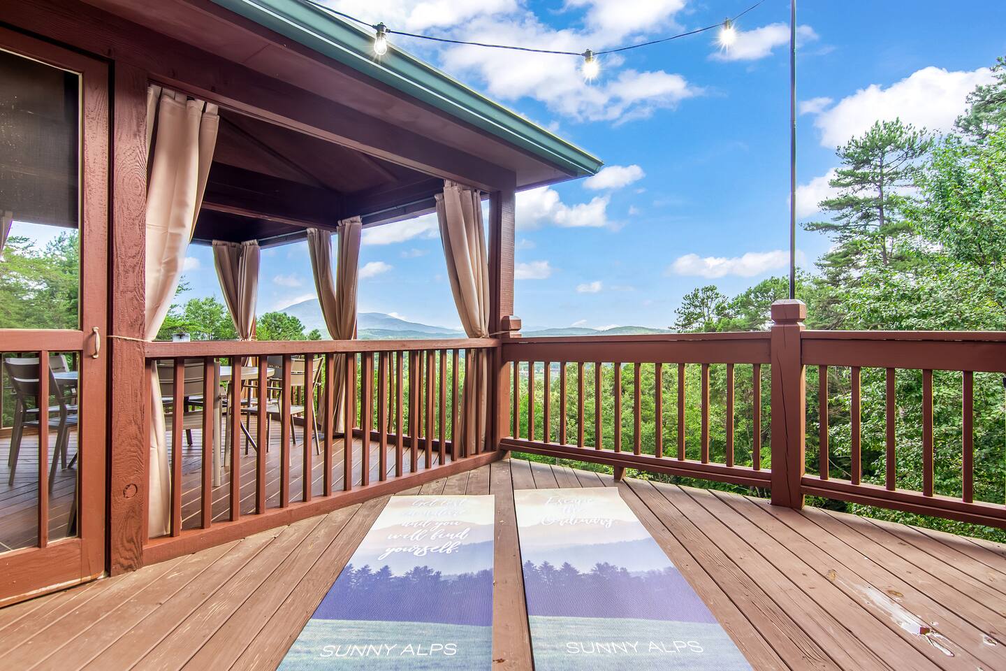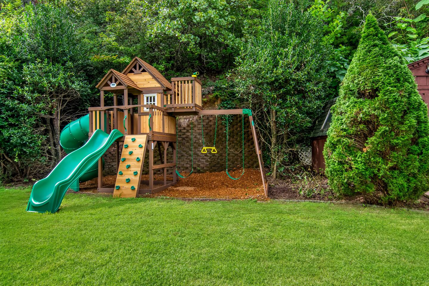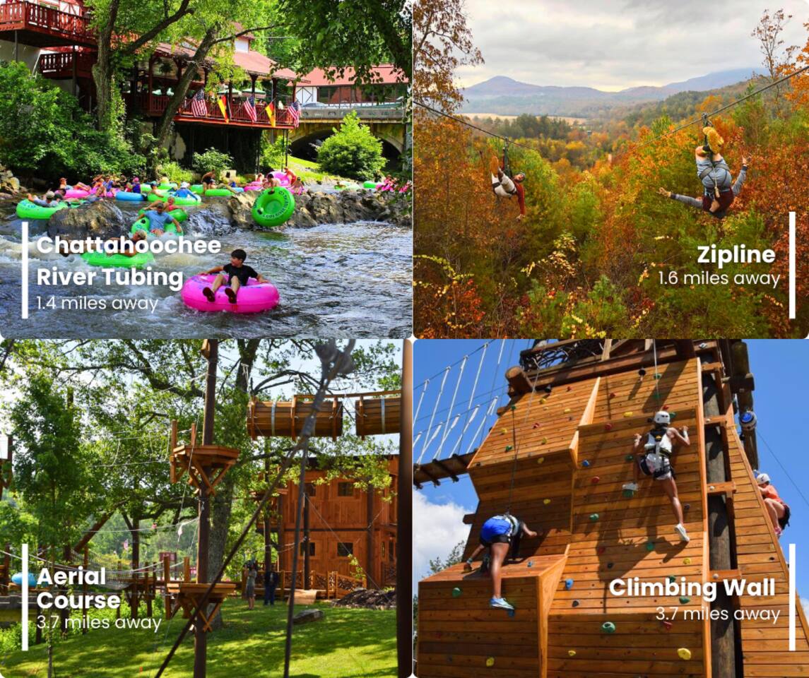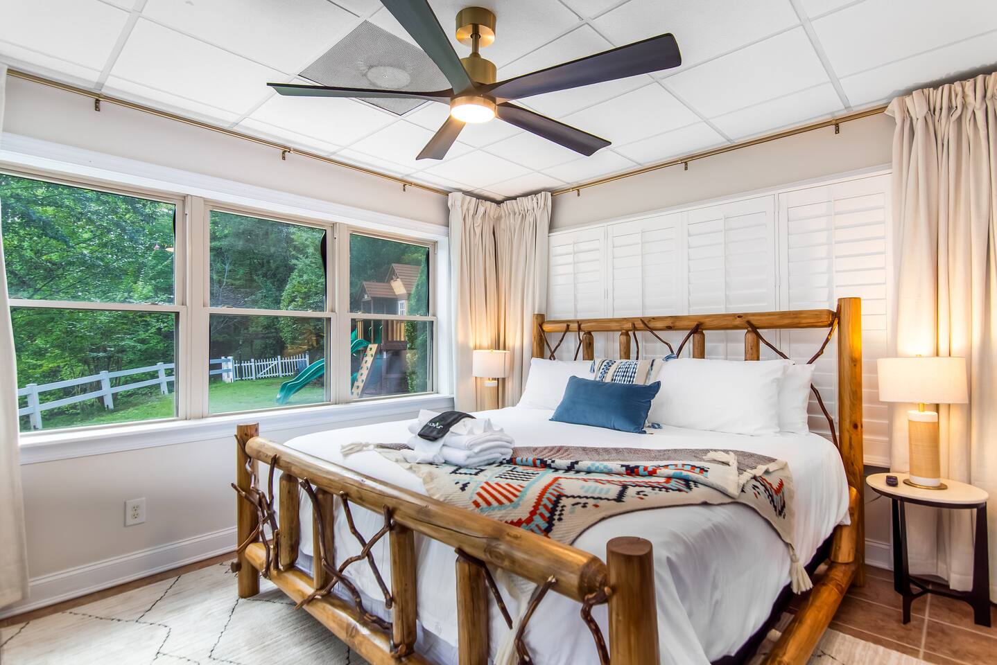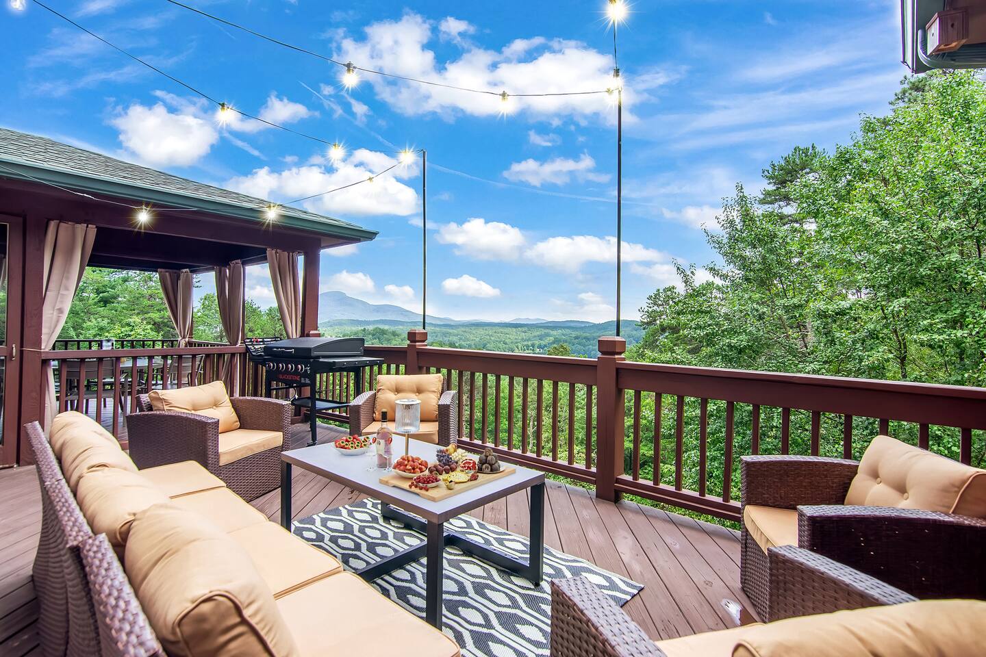 OUTDOOR FUN ZONE Enjoy the finest outdoor living the Blue Ridge Mountains have to offer. ✹ 6-person barrel sauna with panoramic mountain views ✹ 6-person hot tub with programmable LED lights ✹ Premier wooden kids' playground with two slides, a climbing wall, swings, and a lookout tower ✹ Fire pit with 5 Adirondack chairs (firewood provided) ✹ Bed swing ✹ Cornhole ✹ Bocce ball ✹ Badminton ✹ Pickleball court GAME ROOM Hands-down our favorite room with enough fun to keep the entire family entertained for hours! ✹ Pool table ✹ Foosball ✹ Air hockey ✹ Skee ball ✹ Shuffleboard ✹ Two LED-lighting dartboards and scorecard ✹ Street Fighter arcade game ✹ 14-foot live-edge bar and barstool seating for spectators ✹ Two 58" smart TVs MOVIE THEATER ✹ 100" smart TV with surround sound system ✹ Six leather reclining movie theater chairs with cupholders ✹ Two Big Joe bean bag seats ✹ Vintage popcorn machine KIDS GAMING ROOM ✹ Pac-Man arcade game ✹ Golden Tee arcade game ✹ 65" smart TV ✹ Nintendo Switch docking station + 4 controllers ✹ Mitchell Gold Velvet queen-size sleeper sofa ✹ Natural stone gas fireplace LIVING ROOM Enjoy the mountain vibes in this warm living room with views of the mountains and city of Helen. ✹ 65" smart TV ✹ Sling TV with 190 channels ✹ Natural stone gas fireplace ✹ Physical guidebook with local recommendations ✹ Expansive vaulted wood ceiling ✹ Modern mountain decor KITCHEN + DINING This cozy kitchen is fully stocked with everything you’ll need to cook delicious gourmet meals. ✹ Full-size fridge/freezer, dishwasher, 4-burner stove, oven, microwave ✹ Keurig dual coffee machine with both K-cup pods and ground coffee to brew a cup and a carafe of your favorite varieties ✹ Full set of kitchen cooking essentials ✹ Fully-stocked pantry with salt, pepper, spices, and dry goods ✹ Welcome basket with s'mores kit and fire starter ✹ Modern rustic 12-person dining table BEDROOMS 7 bedrooms all equipped with high-end linens, modern furnishings, and comfortable mattresses to ensure that well-deserved rest and relaxation. ✹ Upstairs bedroom 1: king bed, 43” Roku smart TV, private balcony, incredible views of Mt Jonah and the city of Helen ✹ Upstairs bedroom 2: full-over-full custom-built bunk bed, 50” Roku smart TV, two closets, kids' gaming table, leather convertible sofa ✹ Main level bedroom 1: king bed, 50” Roku smart TV, large closet ✹ Main level bedroom 2: king bed, ensuite bath, 50” Roku smart TV, spacious closet ✹ Main level bedroom 3: king bed, 58” Roku smart TV, panormamic mountain view ✹ Lower level bedroom 1: king bed, 43” Roku smart TV, mountain view ✹ Lower level bedroom 2: 3 custom-built bunk beds, small closet, bookcase with a variety of kids books BATHROOMS 4 full bathrooms all with a tub for the little ones. ✹ High-quality linens ✹ Quality shampoo, conditioner, and body wash ✹ Double vanity in 3 of 4 ✹ Two include a jacuzzi tub with bath bombs and epsom salts ✹ Bidet ✹ Hair dryers KITCHENETTE ✹ Full-size fridge/freezer, 4-burner stove, dishwasher ✹ Stocked with dinnerware and glassware LOFT ✹ Designated work area with desk, chair, and second monitor ✹ Kids' gaming/puzzle table ✹ Large assortment of board games and puzzles ✹ Giant Connect 4 ✹ Poker table and chip set ✹ Queen-size velvet sleeper sofa bed ✹ Soaring vaulted wood ceiling with panoramic mountain views and the city of Helen WRAP-AROUND DECK Savor THE best panoramic views of the mountains and the city of Helen. ✹ Outdoor couch, chairs, and coffee table ✹ Cafe string lights ✹ Gas Blackstone BBQ grill ✹ Cozy outdoor gathering space with an 8-person dining table and curtains ✹ Three fans ✹ Yoga mats OTHER AMENITIES ✹ Access to Unicoi State Park hiking trails ✹ High-speed WiFi throughout the home ✹ Laundry room with washer + dryer ✹ Iron and ironing board ✹ Two kids' high chairs ✹ Pack 'n Play ✹ Exterior cameras for security ACTIVITIES / ATTRACTIONS ✹ Innsbruck Golf Course 0.4 mi ✹ Helen Waterpark 1.3 mi ✹ Chattahoochee River Tubing 1.4 mi ✹ Unicoi State Park 1.6 mi ✹ Downtown Helen 1.9 mi ✹ Habersham Winery 1.9 mi ✹ Georgia Mountain Coaster 2.0 mi ✹ Helen Fun Factory 2.6 mi ✹ Uhuburg Castle 3.3 mi ✹ Cool River Adventures Ziplines, Aerial Course & Climbing Wall 3.7 mi ✹ Anna Ruby Falls 5.3 mi ✹ Dukes Creek Falls 7.6 mi